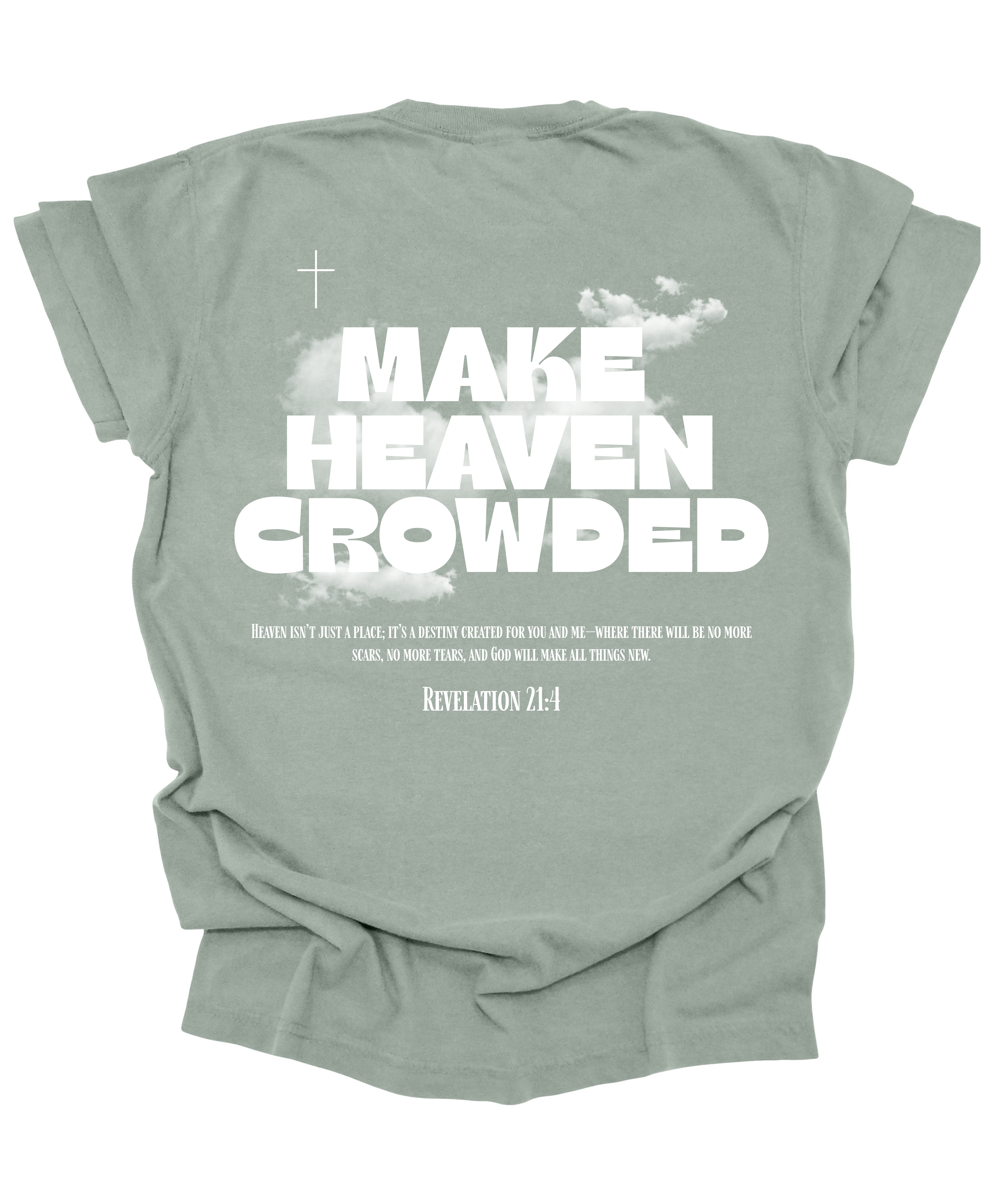 • Bold “MAKE HEAVEN CROWDED” statement on the back