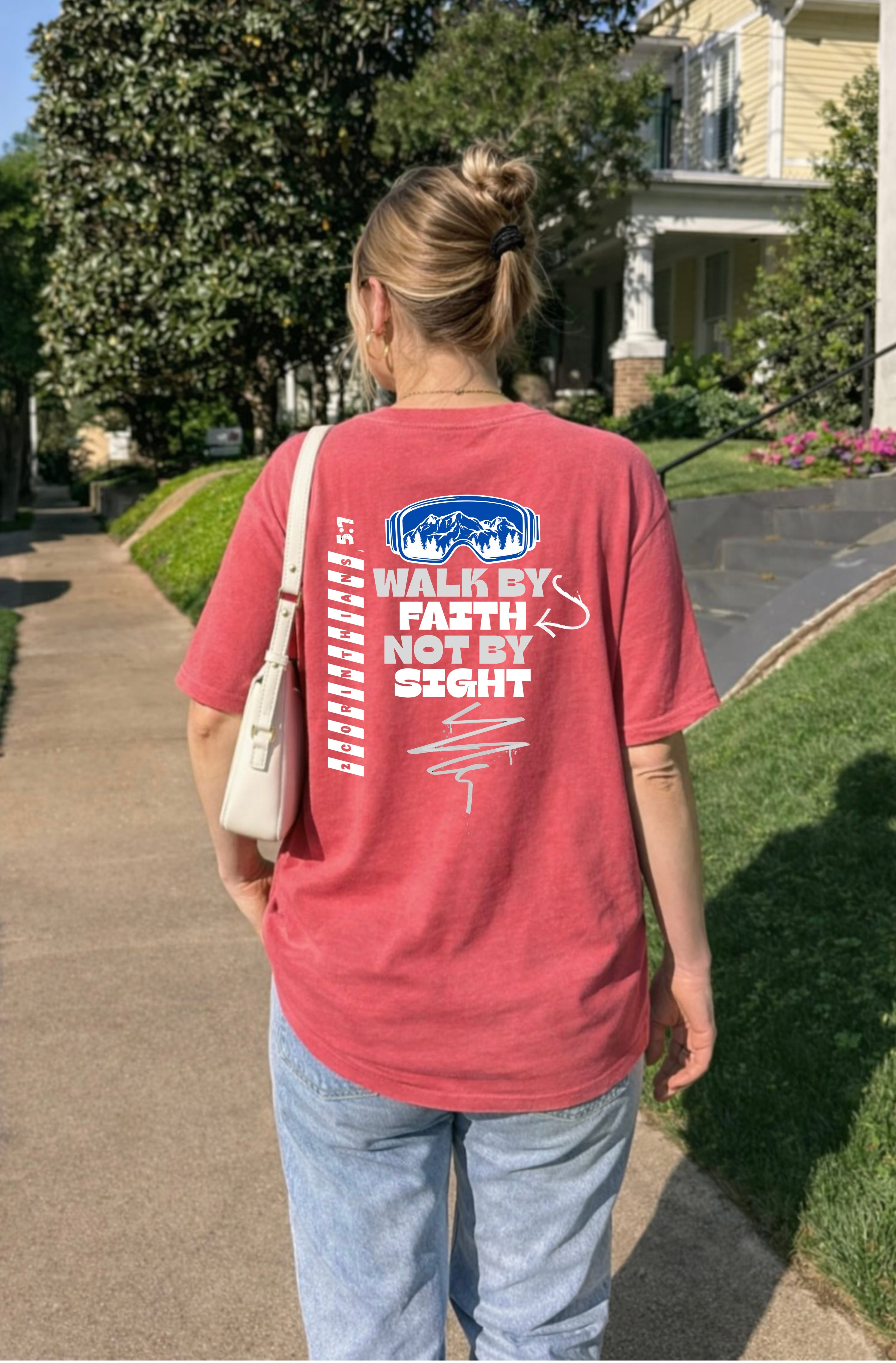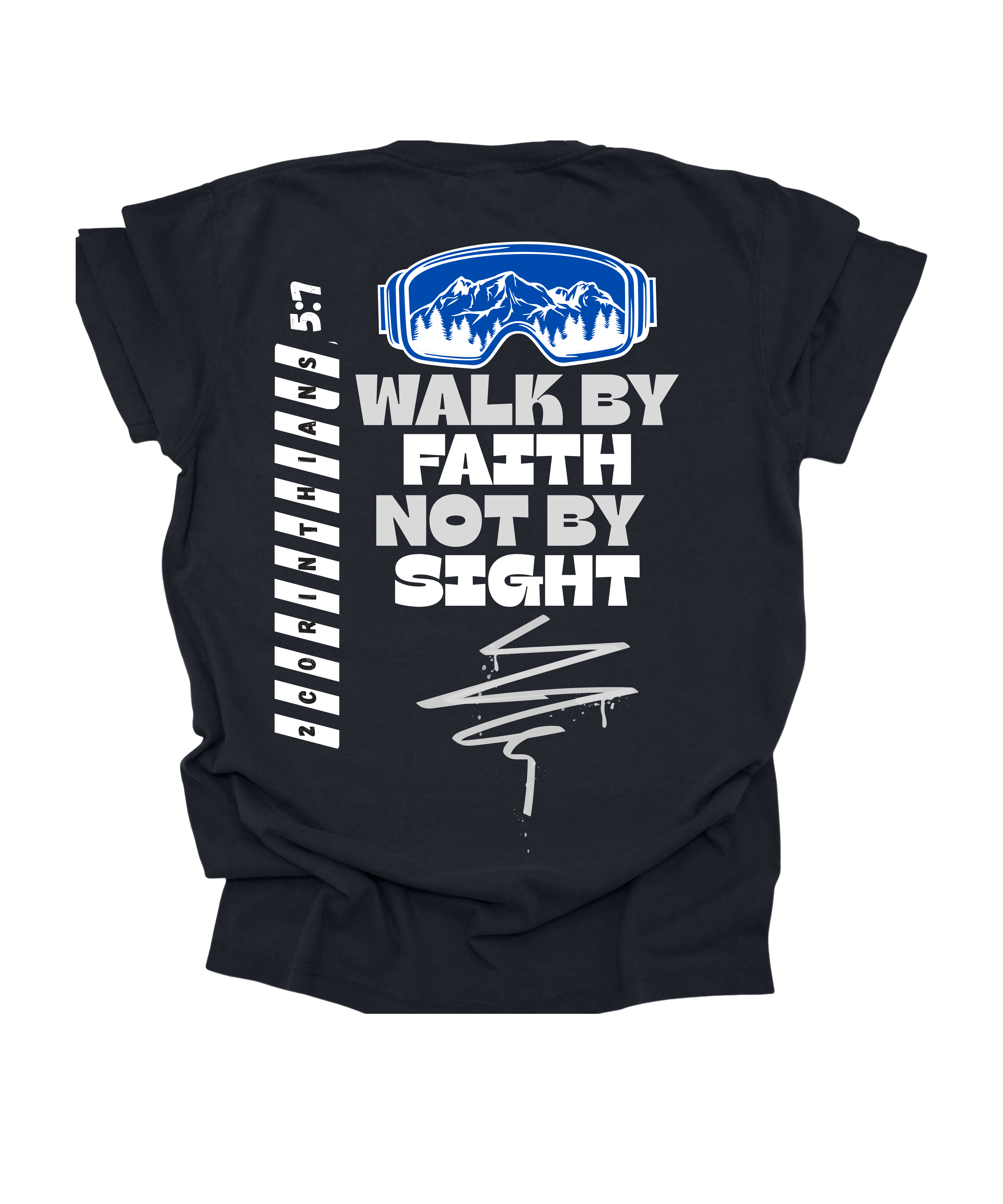Step out in faith with this bold and meaningful Christian tee inspired by 2 Corinthians 5:7. Featuring a striking mountain-and-goggles graphic and modern typography, this design symbolizes trusting God even when the path ahead isn’t clear. It’s a powerful reminder to live by faith—not by what we see.
