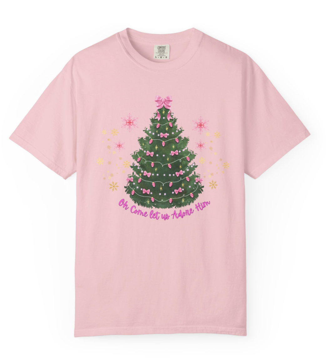 Make your Christmas outfits sweet, cozy, and Christ-centered with this adorable “Oh Come Let Us Adore Him” tee. Featuring a beautifully decorated Christmas tree with pink bows, glowing stars, and a soft festive sparkle, this design brings the perfect mix of girly charm and true Christmas meaning.