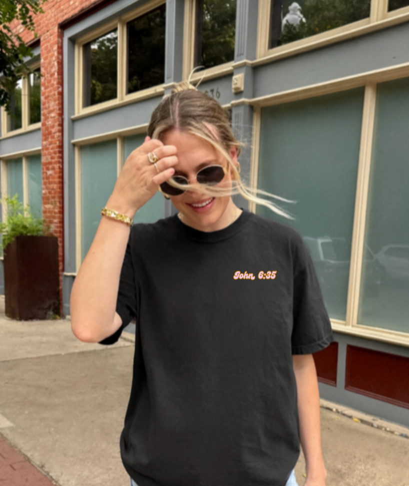 Keep your faith close to your heart with this clean, minimalist black tee. Featuring a soft and subtle "John 6:35" scripture detail on the chest in a warm, inviting pink and orange font, this shirt is perfect for sharing your faith in a simple yet stylish way.